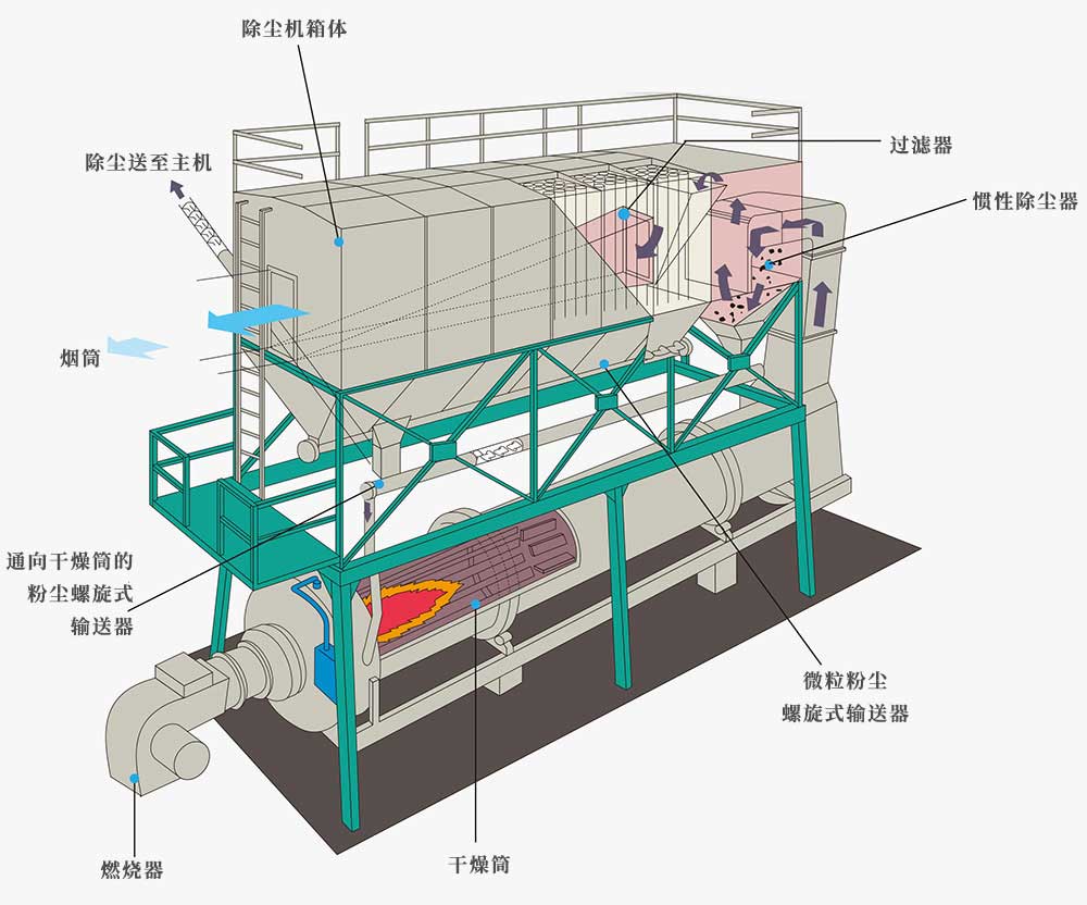 袋式除塵器設置于干燥滾筒上方使煙道縮短,散熱面積大幅減少。采用高壓脈沖清洗方式,布袋損耗小,壽命長,除塵效果好。